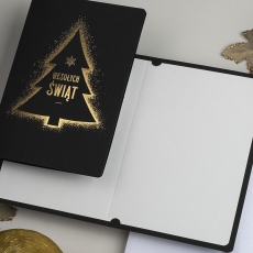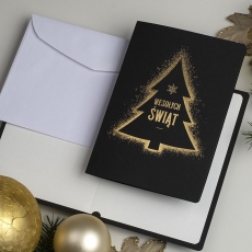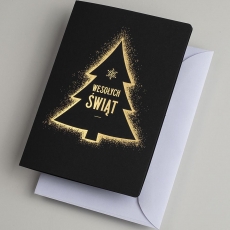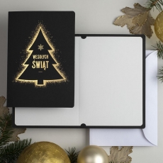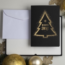 rozmiar: Kartka z najnowszej kolekcji świątecznej, ozdobiona została artystycznym motywem świątecznym. Fantazyjny kształt choinki wykonany za pomocą złotej folii. Złocony Świąteczny Napis życzeń uzupełnia kompozycje Kartki. środek/wkładka (do nadruku treści/życzeń/logo): koperta (z paskiem samozaklejającym): Możliwość zamówienia zamiennie koperty ecru z paskiem samozaklejającym lub klejonej na mokro w kolorze złotym, srebrnym, eko, granatowym, zielonym, czerwonym. Ceny Kopert. sposób łączenia środka z okładką: