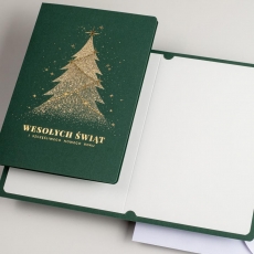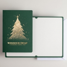 rozmiar: Kartka z najnowszej kolekcji świątecznej, ozdobiona została artystycznym motywem świątecznym. Fantazyjny kształt choinki wykonany za pomocą złotej folii. Złocony Świąteczny Napis życzeń uzupełnia kompozycje Kartki. środek/wkładka (do nadruku treści/życzeń/logo): koperta (z paskiem samozaklejającym): Możliwość zamówienia zamiennie koperty ecru z paskiem samozaklejającym lub klejonej na mokro w kolorze złotym, srebrnym, eko, granatowym, zielonym, czerwonym. Ceny Kopert. sposób łączenia środka z okładką:
