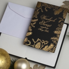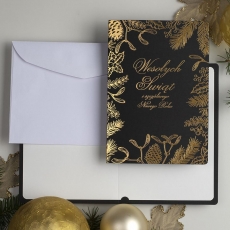 rozmiar: Kartka z najnowszej kolekcji świątecznej, ozdobiona została artystycznym motywem świątecznym. Fantazyjny kształt bombki wykonany za pomocą złotej folii. Złocony Świąteczny Napis życzeń uzupełnia kompozycje Kartki. środek/wkładka (do nadruku treści/życzeń/logo): koperta (z paskiem samozaklejającym): Możliwość zamówienia zamiennie koperty ecru z paskiem samozaklejającym lub klejonej na mokro w kolorze złotym, srebrnym, eko, granatowym, zielonym, czerwonym. Ceny Kopert. sposób łączenia środka z okładką: