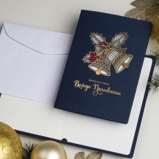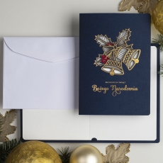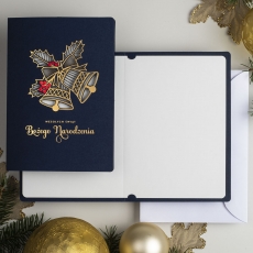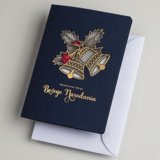 rozmiar: Kartka z najnowszej kolekcji świątecznej, ozdobiona została artystycznym motywem świątecznym. Fantazyjny kształt dzwoneczków świątecznych wykonany za pomocą złotej folii. Dodatkowe elementy pokryte zostały czerwoną folia metaliczną. Poszczególne elementy zdobienia świątecznego wycięte zostały kunsztownie za pomocą lasera. Złocony Świąteczny Napis życzeń uzupełnia kompozycje Kartki. środek/wkładka (do nadruku treści/życzeń/logo): koperta (z paskiem samozaklejającym): Możliwość zamówienia zamiennie koperty ecru z paskiem samozaklejającym lub klejonej na mokro w kolorze złotym, srebrnym, eko, granatowym, zielonym, czerwonym. Ceny Kopert. sposób łączenia środka z okładką: