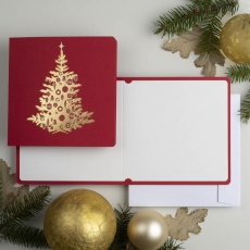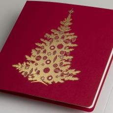 rozmiar: Kartka z najnowszej kolekcji świątecznej, ozdobiona została artystycznym motywem świątecznym. Fantazyjny kształt choinki świątecznej wykonany został za pomocą złotej folii. środek/wkładka (do nadruku treści/życzeń/logo): koperta (z paskiem samozaklejającym): Możliwość zamówienia zamiennie koperty ecru z paskiem samozaklejającym lub klejonej na mokro w kolorze złotym, srebrnym, eko, granatowym, zielonym, czerwonym. Ceny Kopert. sposób łączenia środka z okładką: