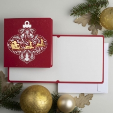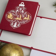rozmiar: Kartka z najnowszej kolekcji świątecznej, ozdobiona została artystycznym motywem świątecznym. Fantazyjny kształt Świątecznej Bombki wykonany za pomocą srebrnej folii. Motyw Złotych Sań Mikołaja wzbogaca projekt kartki. środek/wkładka (do nadruku treści/życzeń/logo): koperta (z paskiem samozaklejającym): Możliwość zamówienia zamiennie koperty ecru z paskiem samozaklejającym lub klejonej na mokro w kolorze złotym, srebrnym, eko, granatowym, zielonym, czerwonym. Ceny Kopert. sposób łączenia środka z okładką:
