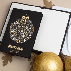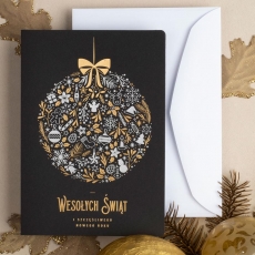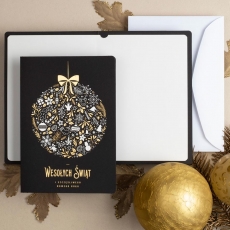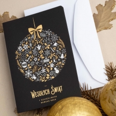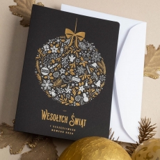 rozmiar: Kartka z najnowszej kolekcji świątecznej, ozdobiona została artystycznym motywem świątecznym. Fantazyjny kształt bombki wykonany za pomocą srebrnej folii. Elementy Złotych Zdobień wzbogacają projekt kartki. Złocony Świąteczny Napis życzeń uzupełnia kompozycje Kartki. środek/wkładka (do nadruku treści/życzeń/logo): koperta (z paskiem samozaklejającym): Możliwość zamówienia zamiennie koperty ecru z paskiem samozaklejającym lub klejonej na mokro w kolorze złotym, srebrnym, eko, granatowym, zielonym, czerwonym. Ceny Kopert. sposób łączenia środka z okładką: