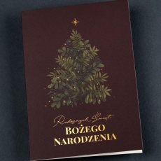 rozmiar: Kartka z najnowszej kolekcji świątecznej, ozdobiona została artystycznym motywem świątecznym. Fantazyjny kształt choinki świątecznej wykonany za pomocą barwnego nadruku offsetowego. Elementy Złotych Zdobień wzbogacają projekt kartki. Złocony Świąteczny Napis życzeń uzupełnia kompozycje Kartki. środek/wkładka (do nadruku treści/życzeń/logo): koperta (z paskiem samozaklejającym): sposób łączenia środka z okładką: