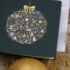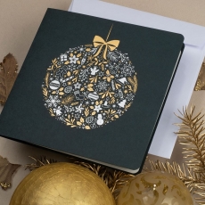 rozmiar: Kartka z najnowszej kolekcji świątecznej, ozdobiona została artystycznym motywem świątecznym. Fantazyjny kształt bombki bożonarodzeniowej wykonany za pomocą srebrnej folii. Elementy Złotych Zdobień wzbogacają projekt kartki. środek/wkładka (do nadruku treści/życzeń/logo): koperta (z paskiem samozaklejającym): Możliwość zamówienia zamiennie koperty ecru z paskiem samozaklejającym lub klejonej na mokro w kolorze złotym, srebrnym, eko, granatowym, zielonym, czerwonym. Ceny Kopert. sposób łączenia środka z okładką: