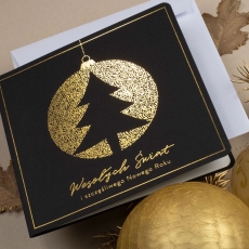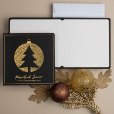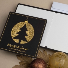 rozmiar: Kartka z najnowszej kolekcji świątecznej, ozdobiona została artystycznym motywem świątecznym. Fantazyjny kształt zawieszonej bombki z choinką wewnątrz wykonany za pomocą Złocenia folią Hot-Print. Elementy Złotych Zdobień motywów świątecznych wzbogacają projekt kartki. Złocony Świąteczny Napis życzeń uzupełnia kompozycje Kartki. środek/wkładka (do nadruku treści/życzeń/logo): koperta (z paskiem samozaklejającym): Możliwość zamówienia zamiennie koperty ecru z paskiem samozaklejającym lub klejonej na mokro w kolorze złotym, srebrnym, eko, granatowym, zielonym, czerwonym. Ceny Kopert. sposób łączenia środka z okładką: