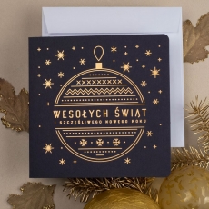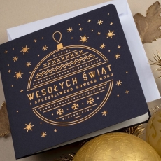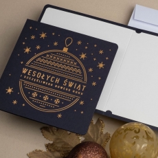 rozmiar: Kartka z najnowszej kolekcji świątecznej, ozdobiona została artystycznym motywem świątecznym. Fantazyjny kształt bombki bożonarodzeniowej wykonany za pomocą Złocenia folią Hot-Print. Elementy Złotych motywów świątecznych wzbogacają projekt kartki. Złocony Świąteczny Napis życzeń uzupełnia kompozycje Kartki. środek/wkładka (do nadruku treści/życzeń/logo): koperta (z paskiem samozaklejającym): sposób łączenia środka z okładką: