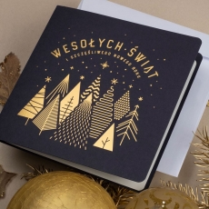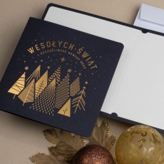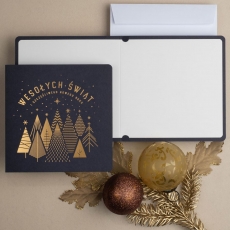 rozmiar: Kartka z najnowszej kolekcji świątecznej, ozdobiona została artystycznym motywem świątecznym. Fantazyjny kształt grupy choinek, wykonany za pomocą Złocenia folią Hot-Print. Elementy Złotych motywów świątecznych wzbogacają projekt kartki. Złocony Świąteczny Napis życzeń uzupełnia kompozycje Kartki. środek/wkładka (do nadruku treści/życzeń/logo): koperta (z paskiem samozaklejającym): Możliwość zamówienia zamiennie koperty ecru z paskiem samozaklejającym lub klejonej na mokro w kolorze złotym, srebrnym, eko, granatowym, zielonym, czerwonym. Ceny Kopert. sposób łączenia środka z okładką: