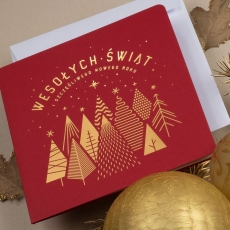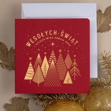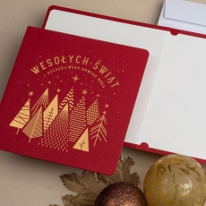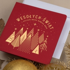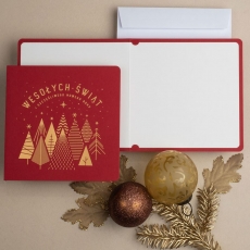 rozmiar: Kartka z najnowszej kolekcji świątecznej, ozdobiona została artystycznym motywem świątecznym. Fantazyjny kształt grupy choinek, wykonany za pomocą Złocenia folią Hot-Print. Elementy Złotych motywów świątecznych wzbogacają projekt kartki. Złocony Świąteczny Napis życzeń uzupełnia kompozycje Kartki. środek/wkładka (do nadruku treści/życzeń/logo): koperta (z paskiem samozaklejającym): Możliwość zamówienia zamiennie koperty ecru z paskiem samozaklejającym lub klejonej na mokro w kolorze złotym, srebrnym, eko, granatowym, zielonym, czerwonym. Ceny Kopert. sposób łączenia środka z okładką: