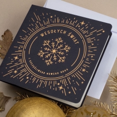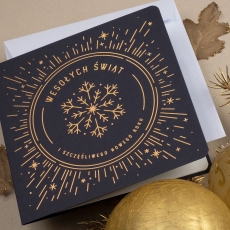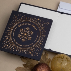rozmiar: Kartka z najnowszej kolekcji świątecznej, ozdobiona została artystycznym motywem świątecznym. Fantazyjny kształt Śnieżynki, oraz Gwiazdek i Promieni, wykonany za pomocą Złocenia folią Hot-Print. Elementy Złotych motywów świątecznych wzbogacają projekt kartki. Złocony Świąteczny Napis życzeń uzupełnia kompozycje Kartki. środek/wkładka (do nadruku treści/życzeń/logo): koperta (z paskiem samozaklejającym): sposób łączenia środka z okładką: