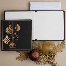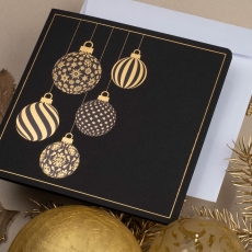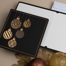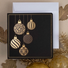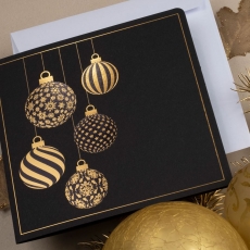 rozmiar: Kartka z najnowszej kolekcji świątecznej, ozdobiona została artystycznym motywem świątecznym. Fantazyjny kształt zawieszonych bombek świątecznych wykonany za pomocą Złocenia folią Hot-Print. Elementy Złotych Zdobień motywów świątecznych wzbogacają projekt kartki. środek/wkładka (do nadruku treści/życzeń/logo): koperta (z paskiem samozaklejającym): Możliwość zamówienia zamiennie koperty ecru z paskiem samozaklejającym lub klejonej na mokro w kolorze złotym, srebrnym, eko, granatowym, zielonym, czerwonym. Ceny Kopert. sposób łączenia środka z okładką: