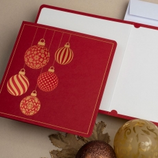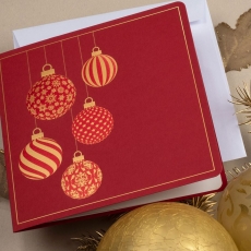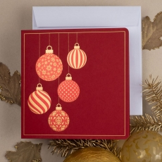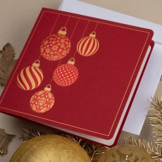 rozmiar: Kartka z najnowszej kolekcji świątecznej, ozdobiona została artystycznym motywem świątecznym. Fantazyjny kształt zawieszonych bombek świątecznych wykonany za pomocą Złocenia folią Hot-Print. Elementy Złotych Zdobień motywów świątecznych wzbogacają projekt kartki. środek/wkładka (do nadruku treści/życzeń/logo): koperta (z paskiem samozaklejającym): Możliwość zamówienia zamiennie koperty ecru z paskiem samozaklejającym lub klejonej na mokro w kolorze złotym, srebrnym, eko, granatowym, zielonym, czerwonym. Ceny Kopert. sposób łączenia środka z okładką: