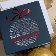 rozmiar: lub bardzo wysokiej jakości elegancki, klasyczny, matowy, barwiony w masie karton w kolorze Granatowym. (gramatura 300g). Kartka z najnowszej kolekcji świątecznej, ozdobiona została artystycznym motywem świątecznej bombki. Fantazyjny kształt bombki świątecznej wykonany został za pomocą srebrnej i czerwonej folii. Srebrzony Świąteczny napis życzeń w wielu językach uzupełnia kompozycje Kartki. środek/wkładka (do nadruku treści/życzeń/logo): koperta (z paskiem samozaklejającym): Możliwość zamówienia zamiennie koperty ecru z paskiem samozaklejającym lub klejonej na mokro w kolorze złotym, srebrnym, eko, granatowym, zielonym, czerwonym. Ceny Kopert. sposób łączenia środka z okładką: