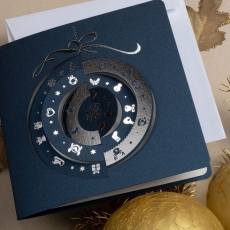 rozmiar: lub bardzo wysokiej jakości elegancki, klasyczny, matowy, barwiony w masie karton w kolorze Granatowym. (gramatura 300g). Kartka z najnowszej kolekcji świątecznej, ozdobiona została artystycznym motywem świątecznej bombki. Fantazyjny kształt bombki świątecznej wykonany został za pomocą srebrnej folii i laserowego wycinania. środek/wkładka (do nadruku treści/życzeń/logo): koperta (z paskiem samozaklejającym): sposób łączenia środka z okładką: