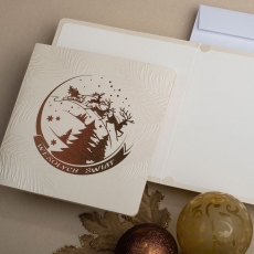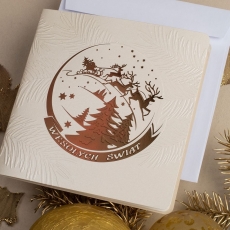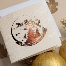 rozmiar: Kartka z najnowszej kolekcji świątecznej, ozdobiona została artystycznym motywem świątecznych sań i choinek. Fantazyjny kształt bożonarodzeniowy wykonany został za pomocą miedzianej folii i tłoczenia. Napis życzeń Wesołych Świąt również został wyzłocony na kolor miedziany i wytłoczony. środek/wkładka (do nadruku treści/życzeń/logo): koperta (z paskiem samozaklejającym): sposób łączenia środka z okładką: