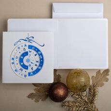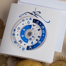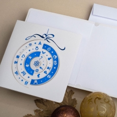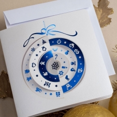 rozmiar: Kartka z najnowszej kolekcji świątecznej, ozdobiona została artystycznym motywem świątecznej bombki. Fantazyjny kształt bombki świątecznej wykonany został za pomocą granatowej folii i laserowego wycinania. środek/wkładka (do nadruku treści/życzeń/logo): koperta (z paskiem samozaklejającym): sposób łączenia środka z okładką: