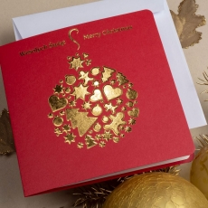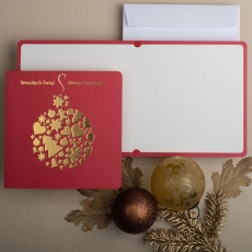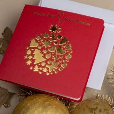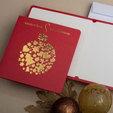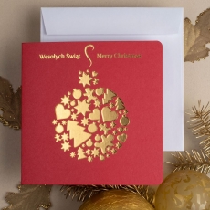 rozmiar: lub bardzo wysokiej jakości elegancki, klasyczny, matowy, barwiony w masie karton w kolorze Czerwonym. (gramatura 300g). Kartka z najnowszej kolekcji świątecznej, ozdobiona została artystycznym motywem świątecznej bombki. Fantazyjny kształt Bombki bożonarodzeniowej wykonany został za pomocą złotej folii i tłoczenia. Napis życzeń Wesołych Świąt i Merry Christmas również został wyzłocony. środek/wkładka (do nadruku treści/życzeń/logo): koperta (z paskiem samozaklejającym): sposób łączenia środka z okładką: