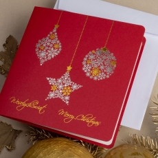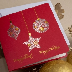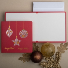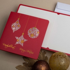 rozmiar: lub bardzo wysokiej jakości elegancki, klasyczny, matowy, barwiony w masie karton w kolorze Czerwonym. (gramatura 300g). Kartka z najnowszej kolekcji świątecznej, ozdobiona została artystycznym motywem zawieszonych świątecznych bombek. Fantazyjny kształt Bombek bożonarodzeniowych wykonany został za pomocą złotej oraz srebrnej folii. Napis życzeń Wesołych Świąt i Merry Christmas również został wyzłocony. środek/wkładka (do nadruku treści/życzeń/logo): koperta (z paskiem samozaklejającym): sposób łączenia środka z okładką:
