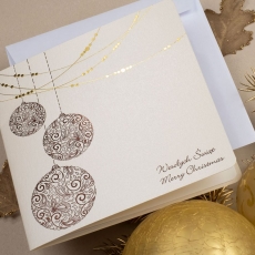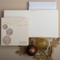 rozmiar: Kartka z najnowszej kolekcji świątecznej, ozdobiona została artystycznym motywem zawieszonych świątecznych bombek na gałązkach. Fantazyjny kształt Bombek bożonarodzeniowych wykonany został za pomocą złotej oraz srebrnej folii. Napis życzeń Wesołych Świąt i Merry Christmas również został wyzłocony. środek/wkładka (do nadruku treści/życzeń/logo): koperta (z paskiem samozaklejającym): Możliwość zamówienia zamiennie koperty ecru z paskiem samozaklejającym lub klejonej na mokro w kolorze złotym, srebrnym, eko, granatowym, zielonym, czerwonym. Ceny Kopert. sposób łączenia środka z okładką: