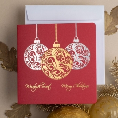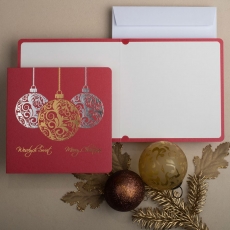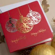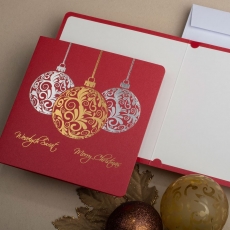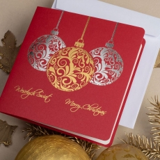 rozmiar: lub bardzo wysokiej jakości elegancki, klasyczny, matowy, barwiony w masie karton w kolorze czerwonym. (gramatura 300g). Kartka z najnowszej kolekcji świątecznej, ozdobiona została artystycznym motywem bożonarodzeniowych bombek. Fantazyjny kształt zawieszonych świątecznych bombek wykonany został za pomocą złotej i srebrnej folii. Napis życzeń Wesołych Świąt i Merry Christmas również został wyzłocony. środek/wkładka (do nadruku treści/życzeń/logo): koperta (z paskiem samozaklejającym): sposób łączenia środka z okładką: