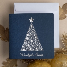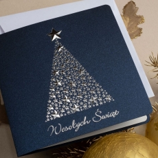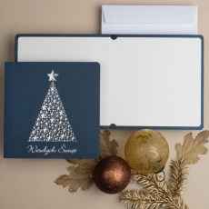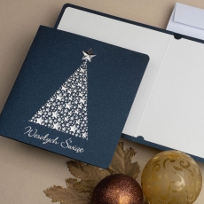 rozmiar: lub bardzo wysokiej jakości elegancki, klasyczny, matowy, barwiony w masie karton w kolorze Niebiesko-Granatowym. (gramatura 300g). Kartka z najnowszej kolekcji świątecznej, ozdobiona została artystycznym motywem świątecznej choinki. Fantazyjny kształt choinki bożonarodzeniowej wykonany został za pomocą srebrnej folii i tłoczeń. Napis życzeń Wesołych Świąt również został wysrebrzony. środek/wkładka (do nadruku treści/życzeń/logo): koperta (z paskiem samozaklejającym): sposób łączenia środka z okładką: