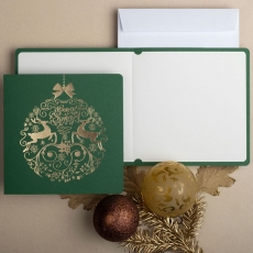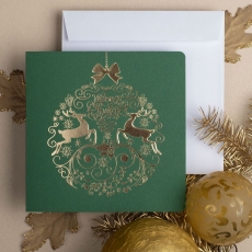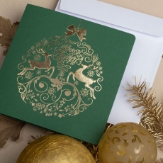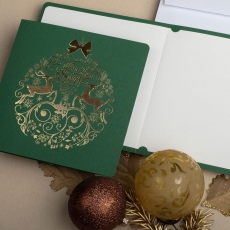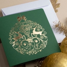 rozmiar: Kartka z najnowszej kolekcji świątecznej, ozdobiona została artystycznym motywem świątecznej bombki z jelonkami. Fantazyjny kształt bombki bożonarodzeniowej wykonany został za pomocą złotej folii i tłoczeń. środek/wkładka (do nadruku treści/życzeń/logo): koperta (z paskiem samozaklejającym): sposób łączenia środka z okładką: