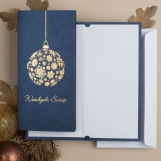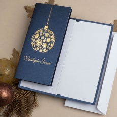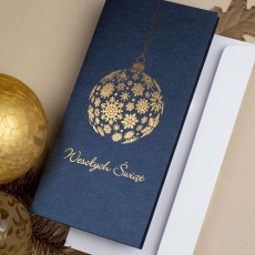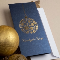 rozmiar: lub bardzo wysokiej jakości elegancki, klasyczny, matowy, barwiony w masie karton w kolorze Granatowym. (gramatura 300g). Kartka z najnowszej kolekcji świątecznej, ozdobiona została artystycznym ornamentem świątecznej bombki. Fantazyjny kształt bombki świątecznej wykonany został za pomocą złotej folii. Złocony Świąteczny napis Wesołych Świąt uzupełnia kompozycje Kartki. środek/wkładka (do nadruku treści/życzeń/logo): koperta (z paskiem samozaklejającym): Możliwość zamówienia zamiennie koperty ecru z paskiem samozaklejającym lub klejonej na mokro w kolorze złotym, srebrnym, eko, granatowym, zielonym, czerwonym. Ceny Kopert. sposób łączenia środka z okładką: