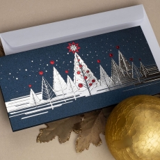 rozmiar: lub bardzo wysokiej jakości elegancki, klasyczny, matowy, barwiony w masie karton w kolorze Granatowym. (gramatura 300g). Kartka z najnowszej kolekcji świątecznej, ozdobiona została artystycznym motywem leśnych, świątecznych choinek. Fantazyjny motyw Bożonarodzeniowych choinek wykonany został za pomocą srebrnej i czerwonej folii, oraz tłoczenia. środek/wkładka (do nadruku treści/życzeń/logo): koperta (z paskiem samozaklejającym): Możliwość zamówienia zamiennie koperty ecru z paskiem samozaklejającym lub klejonej na mokro w kolorze złotym, srebrnym, eko, granatowym, zielonym, czerwonym. Ceny Kopert. sposób łączenia środka z okładką: