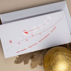 Kartka z najnowszej kolekcji świątecznej, ozdobiona została artystycznym motywem Sań Świętego Mikołaja.