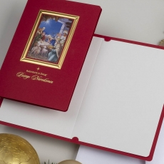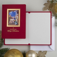 rozmiar: Kartka z najnowszej kolekcji świątecznej, ozdobiona została artystycznym Wzorem Religijnym. Elegancki kształt ramki wykonany za pomocą Tłoczenia i złotej Folii, wewnątrz przyklejony jest drukowany offsetowo wielobarwny obrazek z Motywem Religijnym. Elementy Złotych Zdobień wzbogacają projekt kartki. Złocony Świąteczny Napis życzeń uzupełnia kompozycje Kartki. środek/wkładka (do nadruku treści/życzeń/logo): koperta (z paskiem samozaklejającym): Możliwość zamówienia zamiennie koperty ecru z paskiem samozaklejającym lub klejonej na mokro w kolorze złotym, srebrnym, eko, granatowym, zielonym, czerwonym. Ceny Kopert. sposób łączenia środka z okładką: