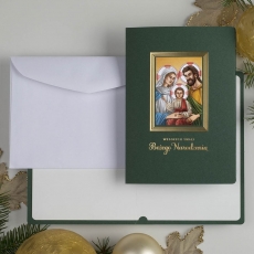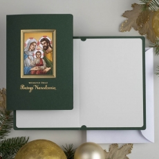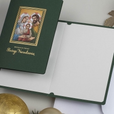 rozmiar: Kartka z najnowszej kolekcji świątecznej, ozdobiona została artystycznym Wzorem Religijnym. Elegancki kształt ramki wykonany za pomocą Tłoczenia i złotej Folii, wewnątrz ramki przyklejony jest drukowany offsetowo wielobarwny obrazek z Motywem Religijnym. Elementy Złotych Zdobień wzbogacają projekt kartki. Złocony Świąteczny Napis życzeń uzupełnia kompozycje Kartki. środek/wkładka (do nadruku treści/życzeń/logo): koperta (z paskiem samozaklejającym): Możliwość zamówienia zamiennie koperty ecru z paskiem samozaklejającym lub klejonej na mokro w kolorze złotym, srebrnym, eko, granatowym, zielonym, czerwonym. Ceny Kopert. sposób łączenia środka z okładką: