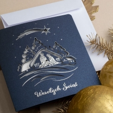 rozmiar: Kartka z najnowszej kolekcji świątecznej, ozdobiona została artystycznym motywem gwiazdy betlejemskiej nad świąteczna wioską. Fantazyjny kształt pejzażu świątecznego wykonany został za pomocą srebrnej folii i laserowego cięcia. Napis życzeń Wesołych Świąt również został wysrebrzony. środek/wkładka (do nadruku treści/życzeń/logo): koperta (z paskiem samozaklejającym): Możliwość zamówienia zamiennie koperty ecru z paskiem samozaklejającym lub klejonej na mokro w kolorze złotym, srebrnym, eko, granatowym, zielonym, czerwonym. Ceny Kopert. sposób łączenia środka z okładką: