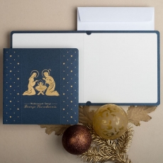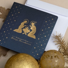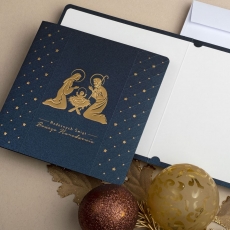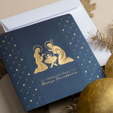 rozmiar: Kartka z najnowszej kolekcji świątecznej, ozdobiona została artystycznym motywem Religijnym Świętej Rodziny. Fantazyjny kształt Religijnej Aplikacji wykonany został za pomocą złotej folii i tłoczeń. Życzenia Świąteczne również zostały Wyzłocone. środek/wkładka (do nadruku treści/życzeń/logo): koperta (z paskiem samozaklejającym): Możliwość zamówienia zamiennie koperty ecru z paskiem samozaklejającym lub klejonej na mokro w kolorze złotym, srebrnym, eko, granatowym, zielonym, czerwonym. Ceny Kopert. sposób łączenia środka z okładką: