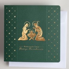 Kartka z najnowszej kolekcji świątecznej, ozdobiona została artystycznym motywem Religijnym Świętej Rodziny.