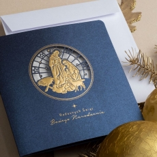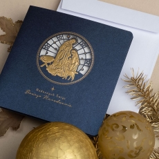 rozmiar: Kartka z najnowszej kolekcji świątecznej, ozdobiona została artystycznym motywem Religijnym Świętej Rodziny. Fantazyjny kształt Religijnej Aplikacji Świątecznej wykonany został za pomocą złotej folii, laserowego cięcia i tłoczeń. Życzenia Świąteczne również zostały Wyzłocone. środek/wkładka (do nadruku treści/życzeń/logo): koperta (z paskiem samozaklejającym): Możliwość zamówienia zamiennie koperty ecru z paskiem samozaklejającym lub klejonej na mokro w kolorze złotym, srebrnym, eko, granatowym, zielonym, czerwonym. Ceny Kopert. sposób łączenia środka z okładką: