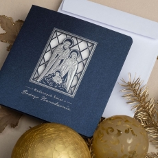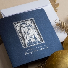 rozmiar: Kartka z najnowszej kolekcji świątecznej, ozdobiona została artystycznym motywem Religijnym Świętej Rodziny. Fantazyjny kształt Religijnej Aplikacji Świątecznej wykonany został za pomocą srebrnej folii, laserowego cięcia i tłoczeń. Życzenia Świąteczne również zostały Wysrebrzone. środek/wkładka (do nadruku treści/życzeń/logo): koperta (z paskiem samozaklejającym): Możliwość zamówienia zamiennie koperty ecru z paskiem samozaklejającym lub klejonej na mokro w kolorze złotym, srebrnym, eko, granatowym, zielonym, czerwonym. Ceny Kopert. sposób łączenia środka z okładką: