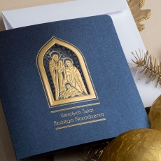 Kartka z najnowszej kolekcji świątecznej, ozdobiona została artystycznym motywem Religijnym Rodziny Świętej.