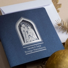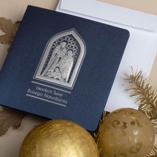 rozmiar: Kartka z najnowszej kolekcji świątecznej, ozdobiona została artystycznym motywem Religijnym Rodziny Świętej. Fantazyjny kształt Religijnej Aplikacji Świątecznej wykonany został za pomocą srebrnej folii, laserowego cięcia i tłoczeń. Życzenia Świąteczne również zostały Wysrebrzone. środek/wkładka (do nadruku treści/życzeń/logo): koperta (z paskiem samozaklejającym): Możliwość zamówienia zamiennie koperty ecru z paskiem samozaklejającym lub klejonej na mokro w kolorze złotym, srebrnym, eko, granatowym, zielonym, czerwonym. Ceny Kopert. sposób łączenia środka z okładką: