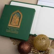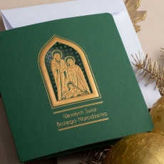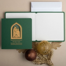 rozmiar: Kartka z najnowszej kolekcji świątecznej, ozdobiona została artystycznym motywem Religijnym Rodziny Świętej. Fantazyjny kształt Religijnej Tematyki Świątecznej wykonany został za pomocą złotej folii, laserowego cięcia i tłoczeń. Życzenia Świąteczne również zostały Wyzłocone. środek/wkładka (do nadruku treści/życzeń/logo): koperta (z paskiem samozaklejającym): Możliwość zamówienia zamiennie koperty ecru z paskiem samozaklejającym lub klejonej na mokro w kolorze złotym, srebrnym, eko, granatowym, zielonym, czerwonym. Ceny Kopert. sposób łączenia środka z okładką: