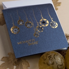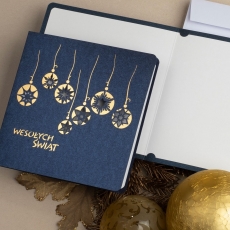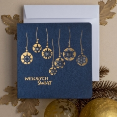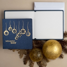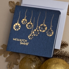 rozmiar: lub bardzo wysokiej jakości elegancki, klasyczny, matowy, barwiony w masie karton w kolorze granatowym. (gramatura 300g). Kartka z kolekcji świątecznej, ozdobiona została artystycznym motywem świątecznych bombek. Fantazyjny kształt bombek bożonarodzeniowych wykonany został za pomocą złotej folii i laserowego cięcia. Napis życzeń Wesołych Świąt również został wyzłocony. środek/wkładka (do nadruku treści/życzeń/logo): koperta (klejona na mokro): sposób łączenia środka z okładką: