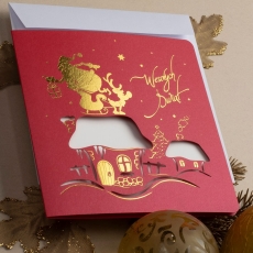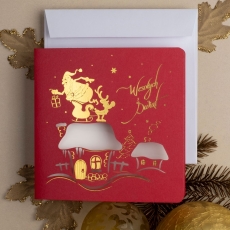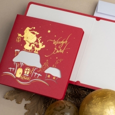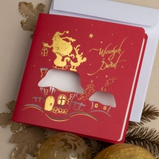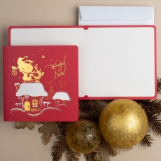 rozmiar: lub bardzo wysokiej jakości elegancki, klasyczny, metowy, barwiony w masie karton w kolorze czerwonym. (gramatura 300g). Kartka z najnowszej kolekcji świątecznej, ozdobiona została artystycznym motywem świątecznej wioski i mikołaja. Fantazyjny kształt bożonarodzeniowej wioski, oraz mikołaja wykonany został za pomocą złotej folii i laserowego cięcia. Napis życzeń Wesołych Świąt również został wyfoliowany hot-print na złoto. środek/wkładka (do nadruku treści/życzeń/logo): koperta (klejona na mokro): sposób łączenia środka z okładką: